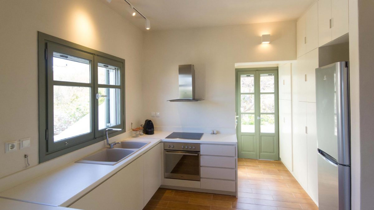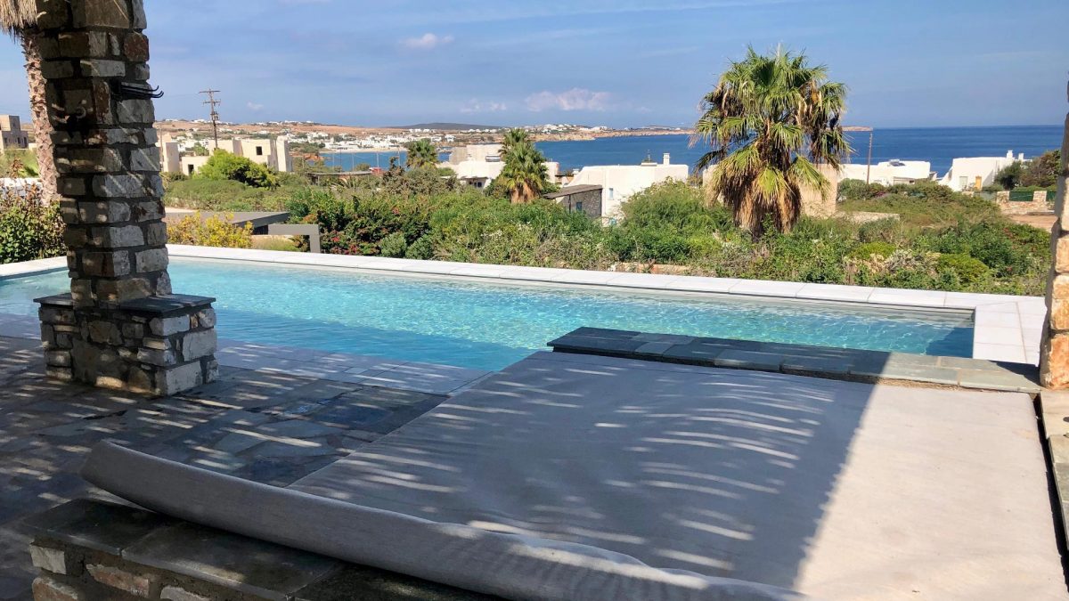 Erato is a wonderful upmarket holiday villa. A beautiful family residence white with green shutters, modern but built with respect to the local minimal Cycladic architecture, using mostly natural, locally sourced materials. With stunning sea views and a large garden. The residence’s large shaded terrace has private pool facing the sea and a built double bed where you will be able to relax day and night and take in Paros views. There is also a BBQ that our residents love to use to cook with herbs picked from our garden. Inside the house has been decorated with comfort and style in mind. There is a large living dining and kitchen area with functional fireplace. The kitchen is modern and fully-equipped with everything you may need. There are four very spacious bedrooms, look out onto the garden and the sea. All four have double beds. One of our bathrooms has a large bath tub and all come with modern showers. Exclusive access in the villa and its garden. The house can host up 8 guests very comfortably. Two gorgeous sandy beaches are just few steps away.